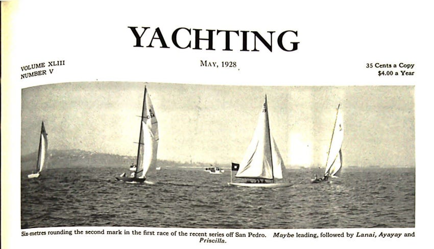 Among his expenditures: Six Meter racing yachts. The Six Meter class was the glamour division of international yacht racing in the 1920s and 1930s — sleek, expensive sloops built in Sweden and shipped across the Atlantic. Haldorn acquired “Ay Ay Ay” (US 34), which arrived in San Francisco Bay for the 1928 racing season.