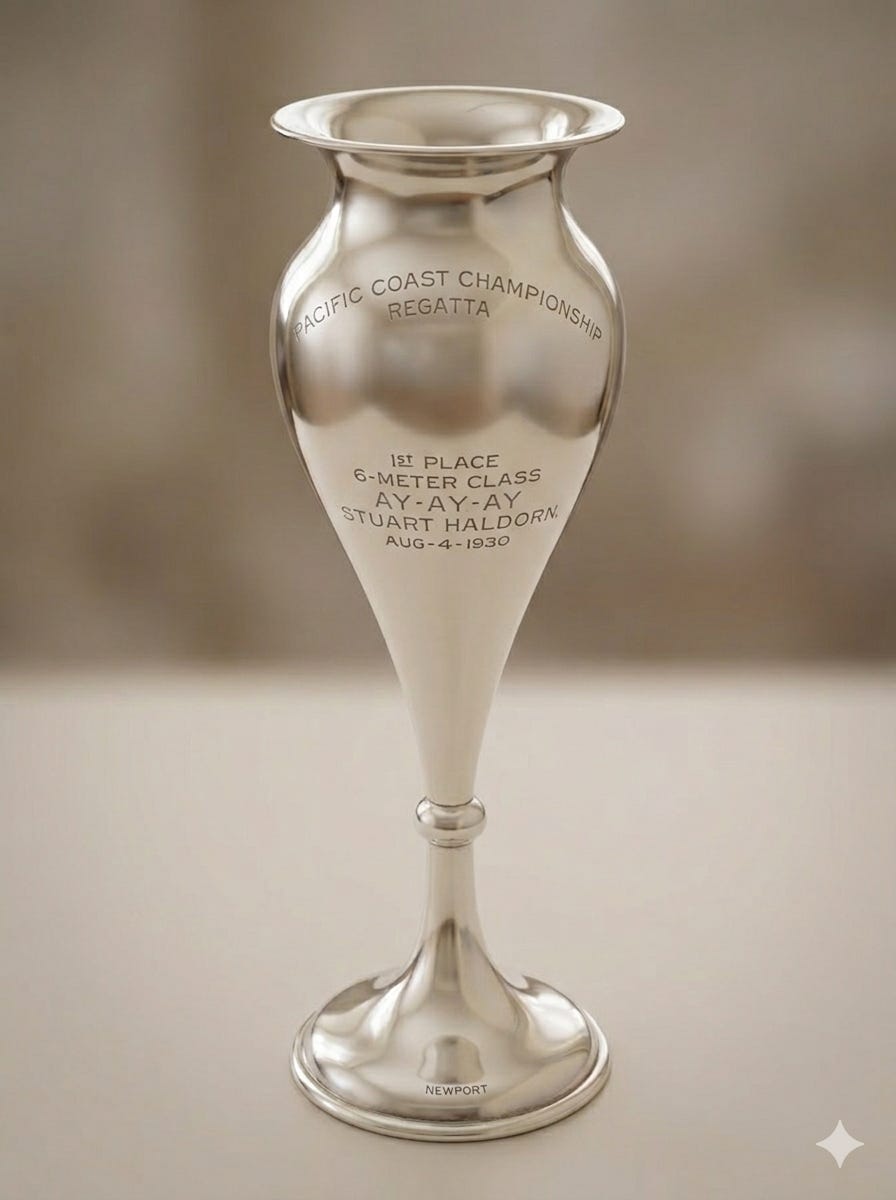 I contacted St. Francis Yacht Club. Their curator, Kimball Livingston, responded immediately. He recognized the trophy as one of a series connected to Dr. Albert Soiland, the founder of the Pacific Coast Yachting Association and Newport Harbor Yacht Club. StFYC already had two similar trophies from Six Meter racing, displayed in a lobby trophy case dedicated to Six Meter history. Livingston proposed placing the Haldorn trophy as a companion to those two, enlarging the story.