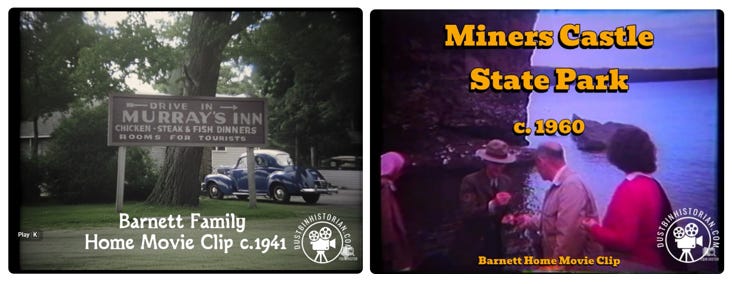 The other clips are simpler but still historically significant. Sailing at White Lake, Michigan, with a cameo of the Murray Inn around 1940. A visit to Colonial Williamsburg. And my favorite: hiking through the Painted Hills and Miners Castle off Lake Superior, circa 1960 — shot before the lookout was constructed and before access to the turrets was cut off. That footage documents a landscape that no longer exists in its accessible form.