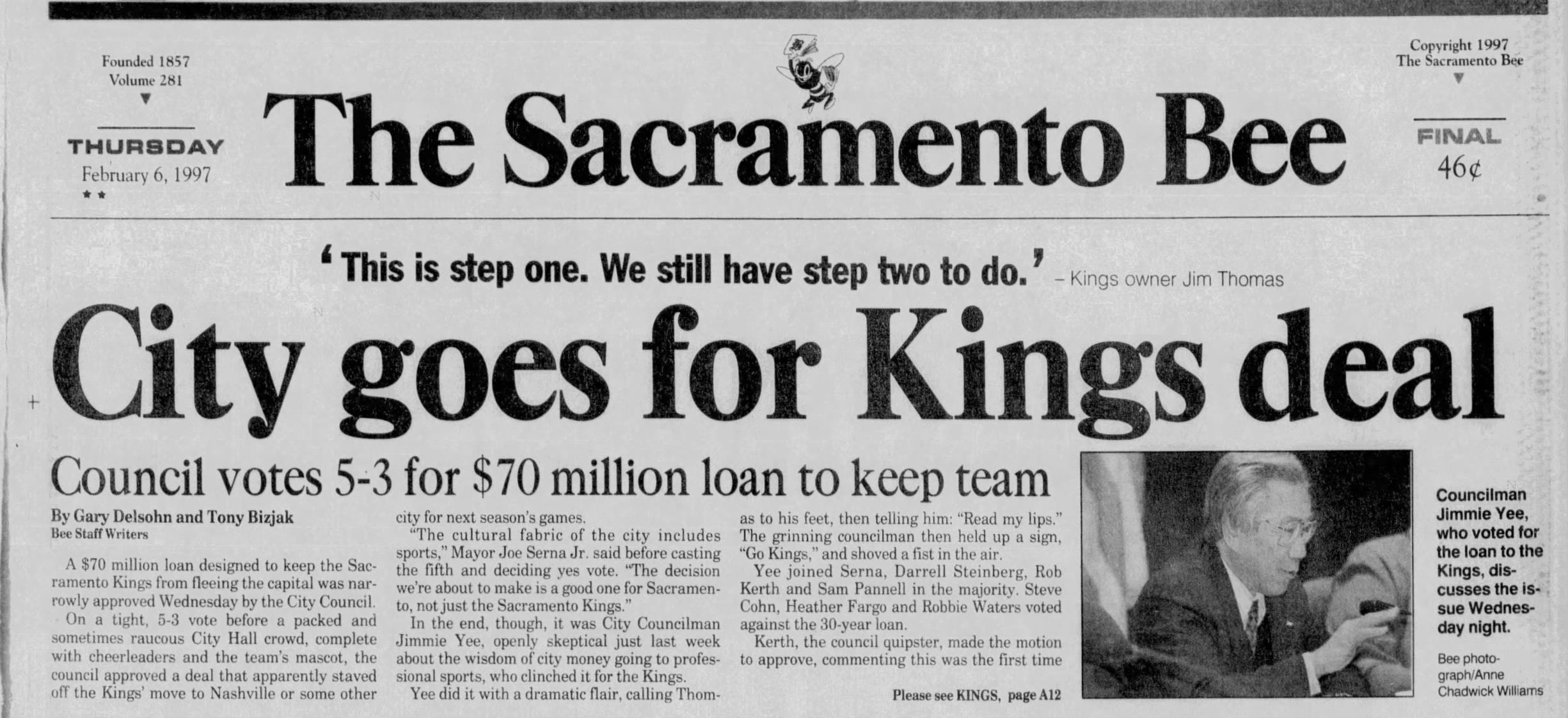I was one of those staff members. My title was Economic Development Manager. My job that night was to present the business terms of a deal that would refinance $90 million in debt on Arco Arena and the Kings, keeping Sacramento’s only major league franchise from leaving town.